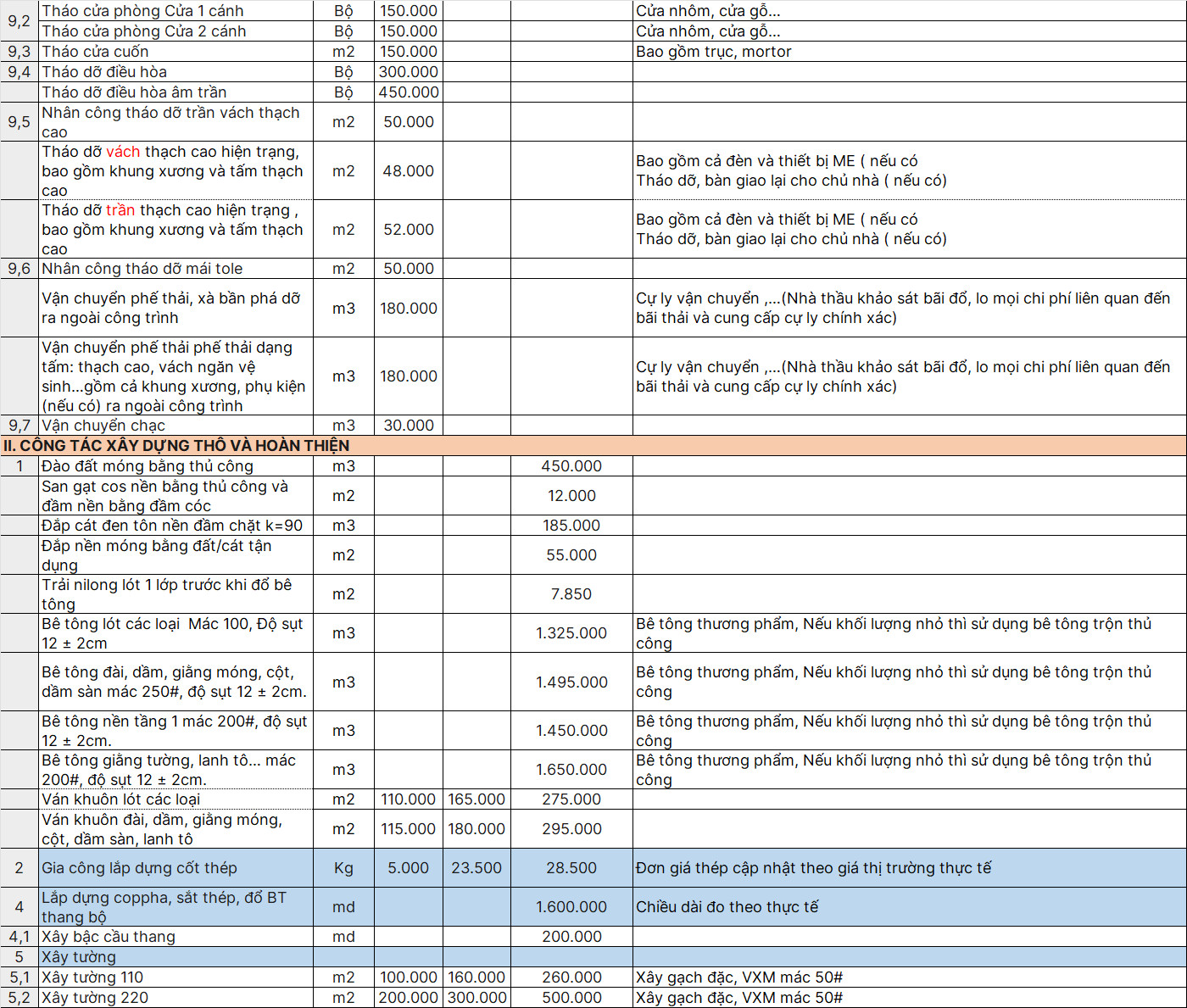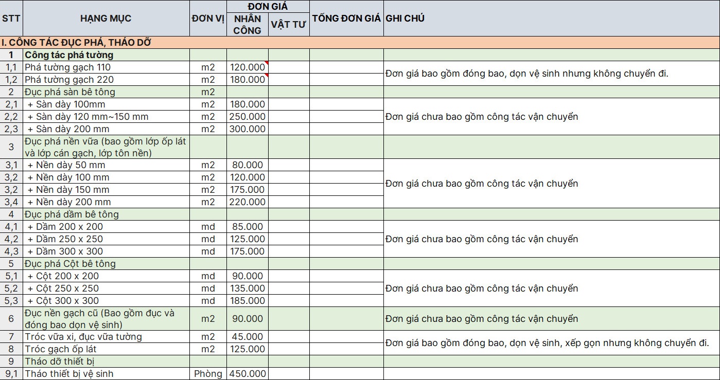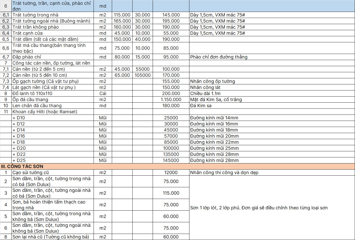 LƯU Ý : Kính thưa quý khách, đây chỉ là bảng giá mang tính chất tham khảo để quý khách có thể dự toán trước kinh phí cho từng hạng mục mà quý khách định sửa chữa. Giá này sẽ còn thay đổi sau khi chúng tôi trực tiếp khảo sát công trinh sửa chữa , cải tạo của quý khách. Quý khách hàng có thể dựa vào đó để phân tích chi phí. Hoặc liên hệ với chúng tôi Qua Hotline/Zalo: 0969569326 để được tư vấn chi tiết.