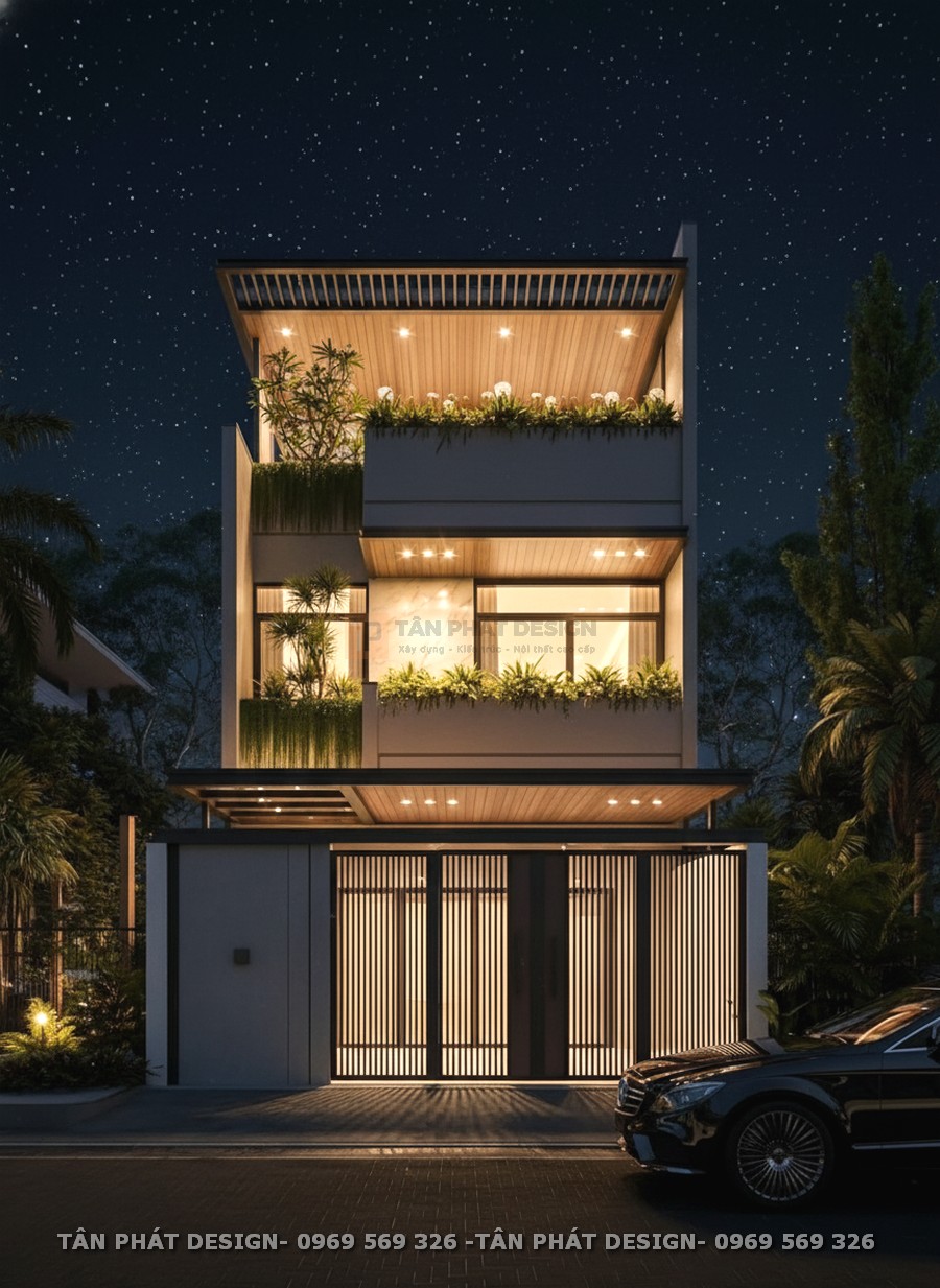 Nhà phố 3 Tầng 5x15m của a Bình tại An Lão Hải Phòng được Tân Phát Design thiết kế như một “tác phẩm đẹp” trong cấu trúc nhà phố điển hình tại Hải Phòng, trên khu đất có chiều sâu không lớn và mặt tiền hẹp đặc trưng dễ gây thiếu sáng, bí gió. Thay vì chỉ giải bài toán công năng, công trình được định hình lại theo hướng cân bằng vi khí hậu và nâng cao trải nghiệm sống cho gia đình trẻ. Kiến trúc hiện đại, tối giản hình khối, ưu tiên thông thoáng tự nhiên; cây xanh, khoảng sân trước và hai giếng trời được bố trí như những điểm dẫn sáng – dẫn gió, tạo dòng đối lưu xuyên suốt từ tầng trệt đến tầng tum. Nhờ đó, ánh sáng có thể len sâu vào lõi nhà, cây xanh hiện diện như một phần của sinh hoạt thường nhật, giúp ngôi nhà vận hành mát hơn vào buổi chiều, sáng hơn vào ban sáng và gắn kết hơn trong từng khoảnh khắc sum họp.